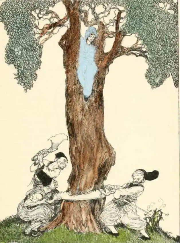 “The Padishah gave orders to fell the tree.” Illustration by Willy Pogany. Published in Forty-Four Turkish Fairy Tales (1913), George G. Harrap & Co.